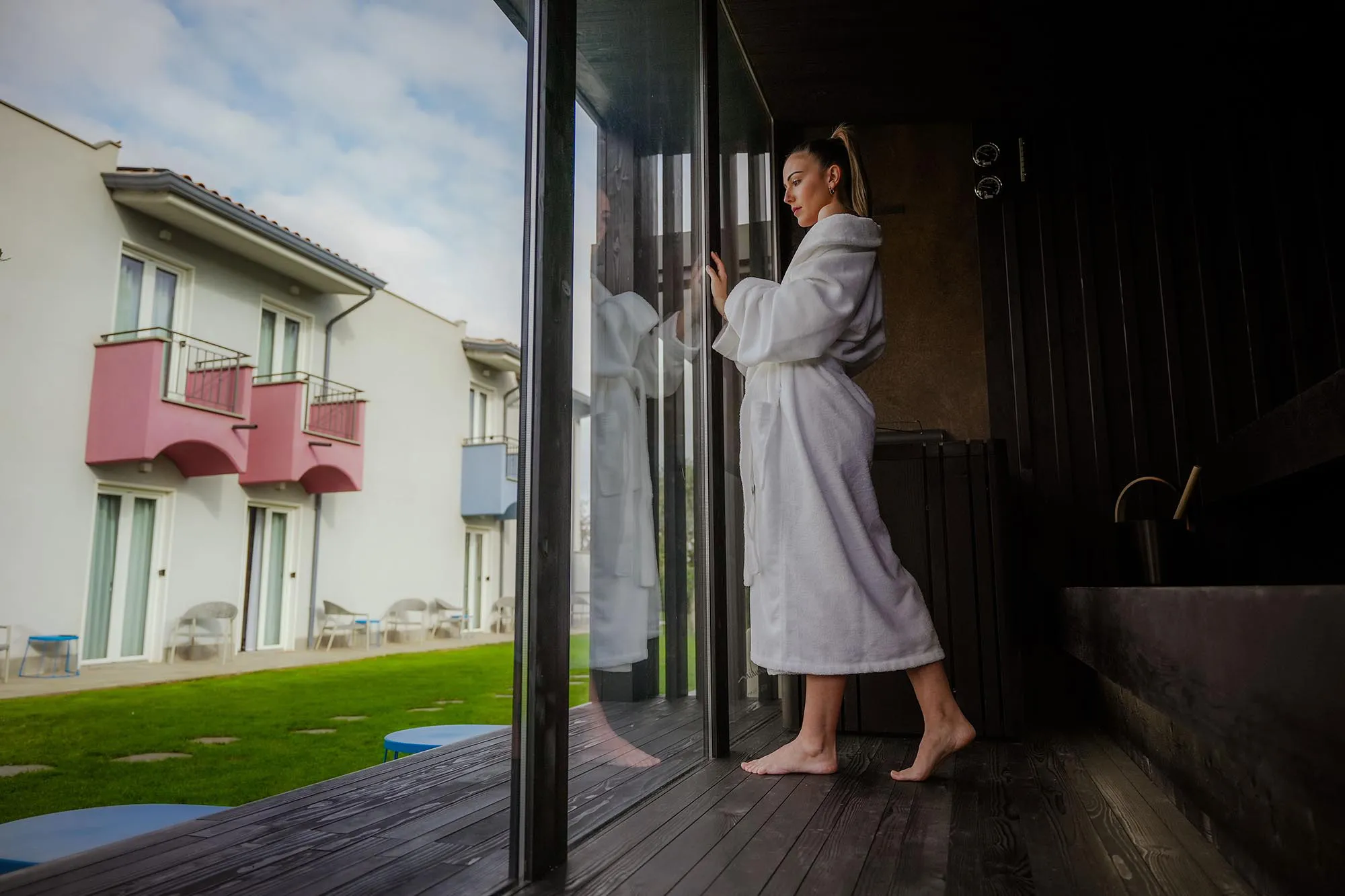 The wellness project is currently being developed outdoors and includes a swimming pool, which features a heated part with a whirlpool, a NatureSauna Starpool with adjacent relaxation area